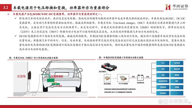 車載電源產(chǎn)品包括OBC和DC-DC變換器等,功率器件為重要原材料之一。 除電動(dòng)汽車的電驅(qū)系統(tǒng)外,承擔(dān)交直流電轉(zhuǎn)換、高低電壓轉(zhuǎn)換等功能的功率器件也是車載電源的組成部分。車載電源包括OBC、DC-DC 變換器等,是電動(dòng)汽車架構(gòu)的重要組成部分。據(jù)威邁斯招股書(shū),車載充電機(jī)(On-board charger,OBC)是指固定安裝在新能源汽車上的 充電機(jī),主要應(yīng)用于交流電充電方式的場(chǎng)景中。在充電過(guò)程中,車載充電機(jī)依據(jù)電池管理系統(tǒng)(BMS)的控制信號(hào),將單相交流電 (220V)或三相交流電(380V)轉(zhuǎn)換為動(dòng)力電池可以使用的高壓直流電,從而實(shí)現(xiàn)對(duì)新能源汽車動(dòng)力電池的充電。 DC/DC變換器則用于高低電壓的變換。據(jù)威邁斯招股書(shū),車載DC/DC變換器的輸入端為動(dòng)力電池,輸出端口連接整車低壓用電設(shè)備和低 壓蓄電池。新能源汽車中的車燈、儀表、電動(dòng)車窗、電動(dòng)座椅等常見(jiàn)低壓用電設(shè)備在運(yùn)行時(shí)無(wú)法直接從高壓動(dòng)力電池取電,需要從低壓 蓄電池取電或借助DC/DC變換器進(jìn)行高低壓變換后才能從高壓動(dòng)力電池取電,同時(shí)低壓蓄電池中儲(chǔ)存的能量同樣是通過(guò)DC/DC變換器從 高壓動(dòng)力電池取電獲得。