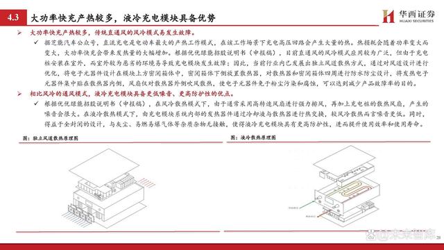 大功率快充產(chǎn)熱較多,傳統(tǒng)直通風(fēng)的風(fēng)冷模式易發(fā)生故障。據(jù)芝能汽車公眾號(hào),直流充電是電動(dòng)車最大的產(chǎn)熱工作模式,在該工作場(chǎng)景下充電高壓回路會(huì)產(chǎn)生大量的熱。熱損耗會(huì)隨著功率變大而 變大,大功率快充會(huì)帶來(lái)發(fā)熱量的大幅增加。根據(jù)優(yōu)優(yōu)綠能招股說(shuō)明書(shū)(申報(bào)稿),目前直通風(fēng)的風(fēng)冷模式應(yīng)用較為廣泛,但由于充電 樁安裝在室外,而室外較為惡劣的環(huán)境易導(dǎo)致充電模塊發(fā)生故障;因此,當(dāng)前行業(yè)內(nèi)已發(fā)展出獨(dú)立風(fēng)道散熱方式,通過(guò)對(duì)風(fēng)道設(shè)計(jì)進(jìn)行 優(yōu)化,將電子元器件設(shè)計(jì)在模塊上方密閉箱體中,密閉箱體下側(cè)放置散熱器,對(duì)散熱器和密閉箱體四周進(jìn)行防水防塵設(shè)計(jì),將發(fā)熱電子 元器件集中貼在散熱器內(nèi)側(cè),風(fēng)扇僅對(duì)散熱器外側(cè)吹風(fēng)散熱,使電子元器件免于粉塵污染和腐蝕,可以達(dá)到減少產(chǎn)品故障率的目的。