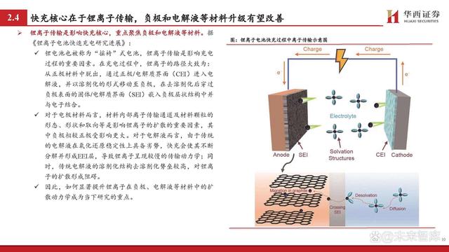 鋰離子傳輸是影響快充核心,重點(diǎn)聚焦負(fù)極和電解液等材料。據(jù) 《鋰離子電池快速充電研究進(jìn)展》: 鋰電池也被稱為“搖椅”式電池,鋰離子傳輸是影響充電 過(guò)程的重要因素。在充電過(guò)程中,鋰離子的路徑大致為: 從正極材料中脫出,通過(guò)正極/電解質(zhì)界面(CEI)進(jìn)入電 解液,并以溶劑化的形式移動(dòng)至負(fù)極,在去溶劑化后穿過(guò) 負(fù)極表面的固體/電解質(zhì)界面(SEI)嵌入負(fù)極層狀結(jié)構(gòu)中并 與電子結(jié)合。 對(duì)于電極材料而言,材料內(nèi)部離子傳輸通道及材料顆粒的 形態(tài)、形狀和取向等是影響鋰離子的擴(kuò)散的重要因素,其 中負(fù)極相較正極受影響更大。對(duì)于電解液而言,由于傳統(tǒng) 的電解液在氧化還原穩(wěn)定性上具備劣勢(shì),快充會(huì)使其不斷 分解并形成EEI層,導(dǎo)致鋰離子呈現(xiàn)較慢的傳輸動(dòng)力學(xué);同 時(shí),傳統(tǒng)電解液的溶劑化結(jié)構(gòu)去溶劑化勢(shì)壘較高,對(duì)鋰離 子的擴(kuò)散形成阻礙。 因此,如何顯著提升鋰離子在負(fù)極、電解液等材料中的擴(kuò) 散動(dòng)力學(xué)成為當(dāng)下研究的重點(diǎn)。