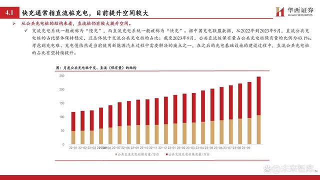 從公共充電樁的結(jié)構(gòu)來(lái)看,直流樁仍有較大提升空間。 交流充電系統(tǒng)一般被稱為“慢充”,而直流充電系統(tǒng)一般被稱為“快充”。據(jù)中國(guó)充電聯(lián)盟數(shù)據(jù),從2022年到2023年9月,直流公共充 電樁的占比整體保持穩(wěn)定,且總體低于交流公共充電樁的占比;截至2023年9月,公共直流樁保有量占公共充電樁保有量的比例為43.1%。 考慮到充電難、充電慢依然是當(dāng)前使用新能源汽車過(guò)程中需要解決的痛點(diǎn)之一,在之后的充電基礎(chǔ)設(shè)施的建設(shè)過(guò)程中,直流公共充電樁 的占比有望持續(xù)提升。