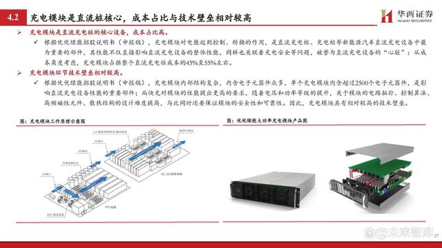 充電模塊是直流充電樁的核心設(shè)備,成本占比高。 根據(jù)優(yōu)優(yōu)綠能招股說(shuō)明書(shū)(申報(bào)稿),充電模塊對(duì)電能起到控制、轉(zhuǎn)換的作用,是直流充電樁、充電柜等新能源汽車直流充電設(shè)備中最 為重要的部件,其性能不僅直接影響直流充電設(shè)備的整體性能,同樣也關(guān)聯(lián)著充電安全等問(wèn)題,被譽(yù)為直流充電設(shè)備的“心臟”;從成 本角度考慮,充電模塊占據(jù)整個(gè)直流充電樁成本的45%至55%左右。