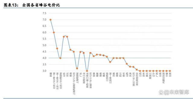 國家發(fā)改委推動合理拉大峰谷電價差,引導電力用戶削峰填谷。2021 年 7 月,國家發(fā)改委 印發(fā)《關(guān)于進一步完善分時電價機制的通知》,部署各地進一步完善分時電價機制,合理拉 大峰谷電價價差,為引導電力用戶削峰填谷、促進儲能加快發(fā)展釋放了清晰強烈的價格信 號:(1)優(yōu)化峰谷電價機制:積極優(yōu)化峰谷電價機制,科學劃分峰谷時段,合理確定峰谷 電價價差,系統(tǒng)峰谷差率超過 40%的地方,峰谷電價價差原則上不低于 4:1;其他地方原 則上不低于 3:1。(2)建立尖峰電價機制:在峰谷電價的基礎上推行尖峰電價機制,主要基 于系統(tǒng)最高負荷情況合理確定尖峰時段,尖峰電價在峰段電價基礎上上浮比例原則上不低 于 20%。可參照尖峰電價機制建立深谷電價機制。隨后,各省市分時電價政策步入快速完 善期,出臺相關(guān)政策調(diào)整峰谷時段劃分和電價浮動比例。